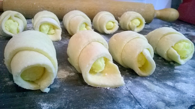 Prvo sam zamislila da razvijem testo u krug i da samo taj puding sa kokosom premazem preko,pa da secem trouglove i da motam:)Medjutim...uvidela sam kako je taj fil gust i resih da pravim valjcice i stavljam na krajeve pa da onda motam kiflice.